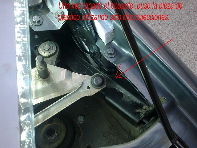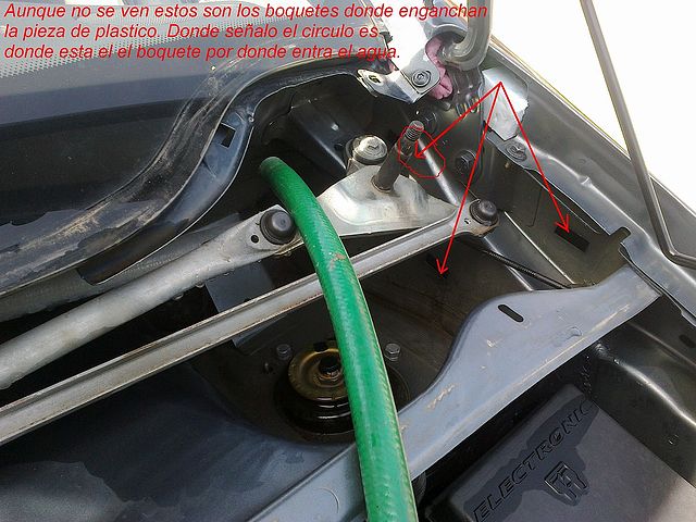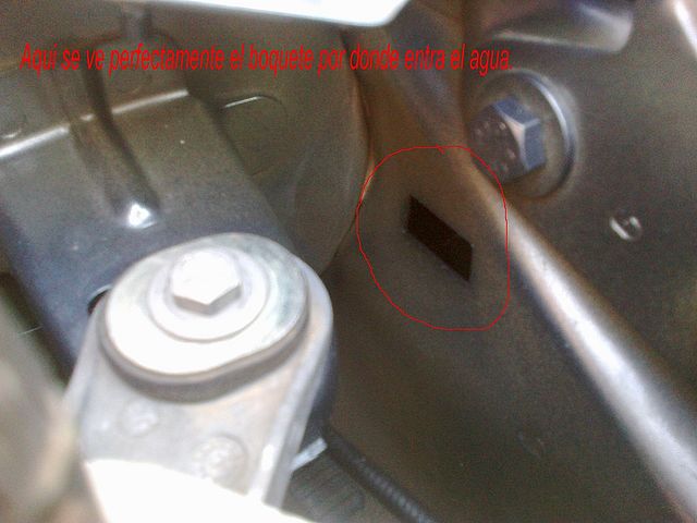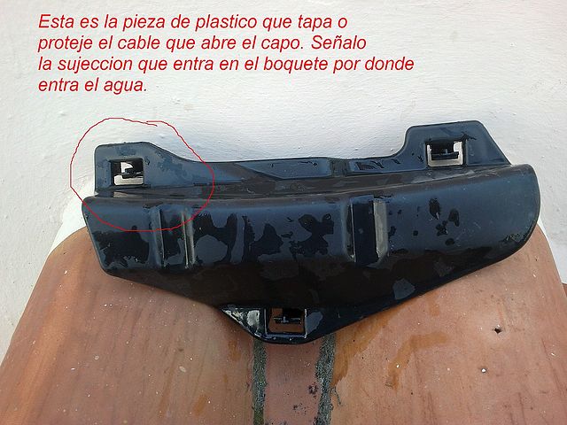 A la derecha del compartimento del motor (capo) hay una pieza de plastico que cubre o proteje el cable que abre el capo. Esa pieza lleva 3 sujecciones en la chapa. Pues por uno de los boquetes donde se sujeta esa pieza es por donde me entra el agua a chorros. Curiosamente por los otros dos no me entra ni una gota. Si alguien sabe el porque que lo explique. A continuacion pongo unas fotos.
