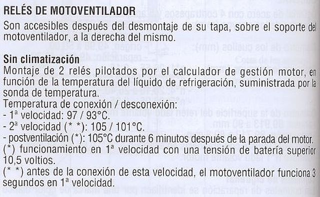 y desde que cambie el termostato y su respectiva junta, me hace X ciclos bien (encenderse el electroventilador y pararse cuando ya esta frio) y a esos X ciclos, se queda el electro encendido a baja velocidad, no para, lo tengo trabajando a 90º o un poquillo menos de 90º y no se para. Lo que he hecho hasta ahora, es: cambiar el sensor de temperatura del anticongelante que va por encima del termostato, y cambiar el anticongelante completamente, y limpiarlo y hecharle un anticongelante de al 30% que es lo que lleva y eso me dijeron, y yo lo llevava al 10%, nose que puede estar fallando, si dais con una posible solucion, decidmelo y le ataco, si es tema reles...decidme donde estan porque no consigo encontrarlos gracias y saludos!