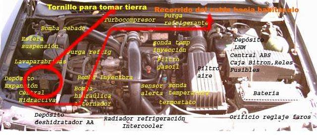 Bueno pues bien os bajáis al coche y comenzáis la instalación de un cable que debería ir desde la zona del motor hacia dentro de la siguiente manera