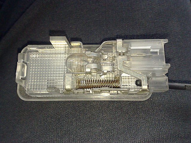 -En primer lugar hay que utilizar una palanca tipo destornillador plano o algo así, pero con mucho cuidado y alternando por varias partes para sacar la tulipa sin romperla, cuando esté para salir hay que tirar un poco hacia atras para que salga el pulsador que hace el contacto cuando la tapa de la guantera se abre o se cierra. Una vez fuera y antes de quitarle la corriente noté que se encendia cuando la movia, es decir, que la bombilla no estaba fundida sino que habia un mal contacto, para ver el mecanismo de cerca desconecté el clip de corriente y me puse a ello, estó es lo que me encontré: