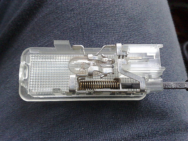 -El mecanimo es simple, hay un muelle que cuando el pulsador está comprimido (la tapa de la guatera está cerrada) no deja pasar la corriente entre las dos chapitas y por lo tanto la bombilla se apaga y,por otro lado, cuando el muelle está elongado (la tapa de la guantera está abierta) el muelle hace de contacto entre las chapitas y deja pasar la corriente para que se encienda la bombilla.
