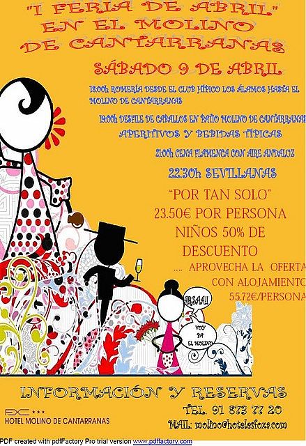 Y lo que han montado para la ocasión, (desconozco si por pura casualidad) es la " I FERIA DE ABRIL EN EL MOLINO DE CANTARRANAS " cuya publicidad anexo en los siguientes 2 archivos.Nos mandaron este e-mail que reproduzco a continuación:Buenos días, tras conversación telefónica mantenida con usted, adjunto cartel informativo referente a nuestro evento de la feria de abrilEsperamos sea de su agrado, no dude en ponerse en contacto con nosotros para cualquier aclaración
